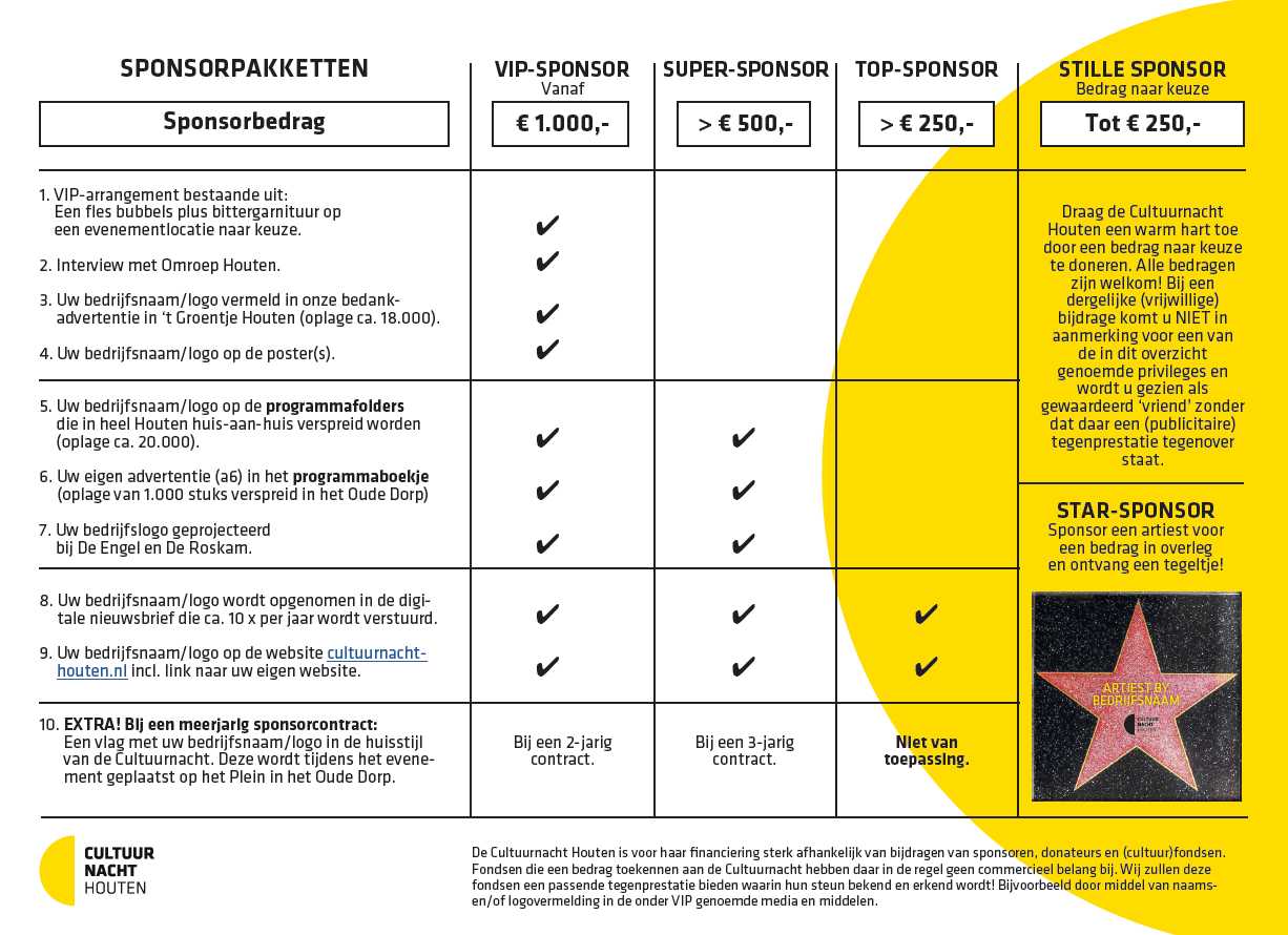 Uiteraard wordt het logo van uw bedrijf op de diverse promotiemiddelen, waaronder de programmafolder, vermeld. In de bijlage (pdf) vind u alles over de sponsorpakketten (5) die we beschikbaar hebben. Van Stille-sponsor tot VIP-sponsor. Ook kunt u als Star-sponsor een artiest of act sponsoren. Mocht u interesse hebben dan vernemen wij dat graag van u.